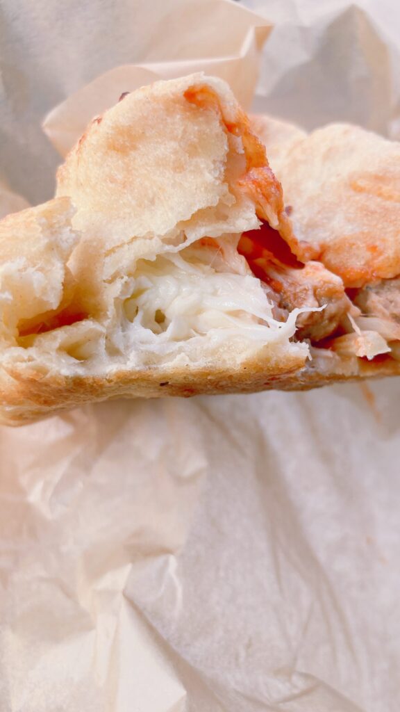 生地はしっかりとしたパン生地で、かじると中は熱々のトマトソースがベースになっています。